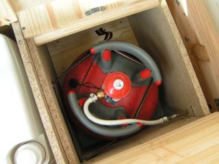 Par facilité j'ai choisi un coffre à gaz pour une bouteille de 6kg de type Twiny car les contraintes règlementaires sont bien moins importantes. La bouteille doit être sanglée, avec une empreinte au sol pour ne pas qu'elle glisse, dans un coffre fermé. Situé dans la banquette, le miens est en bois avec une charnière et un loquet pour la porte. Une aération est obligatoire. Pour ma part, j'ai fait un trou de 5 cm de diamètre dans le plancher avec un tube qui le traverse. C'est parfait selon les dires du gars de Bureau Véritas.
